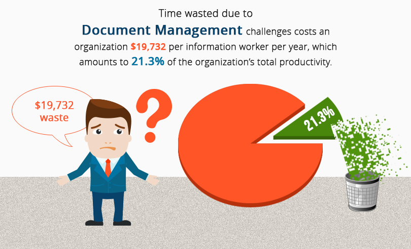 A survey by IDC showed that information workers wasted a significant amount of time each week dealing with a variety of challenges related to working with documents. The wasted time costs the organization $19,732 per information worker per year and amounts to a loss of 21.3% in the organization’s total productivity.